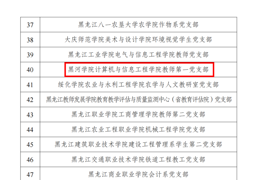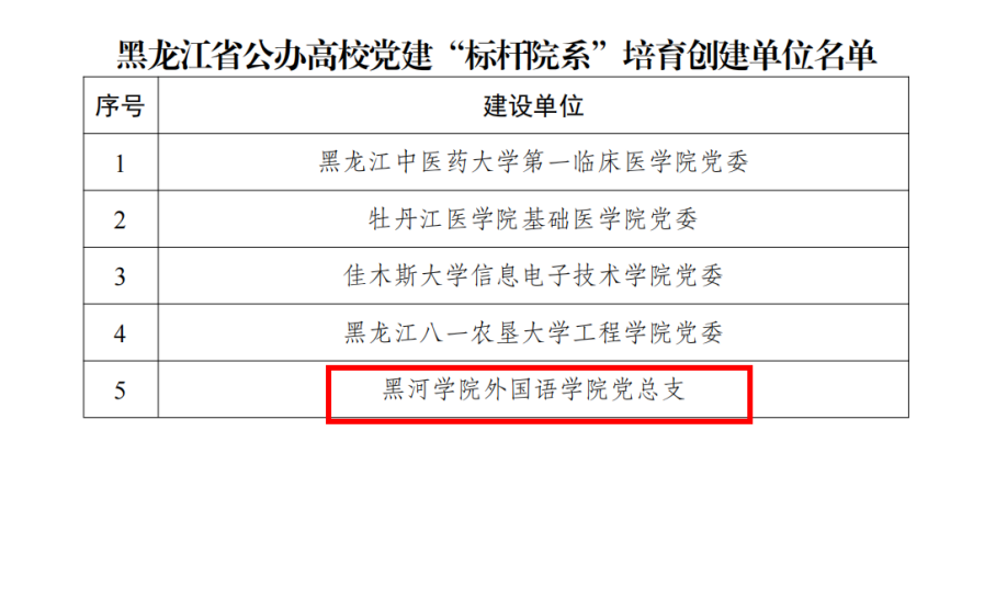 按照《关于推动高校基层党建服务振兴发展、深化提质增效的具体举措》工作安排和《关于开展黑龙江省公办高校党建“示范创建”的通知》有关要求,学校组织部组织各党总支、党支部积极申报,经过学校党委把关,省委教育工委组织资格审查、专家评审,省委教育工委、省教育厅党组会研究,最终确定了黑龙江省公办高校党建“标杆院系”创建单位13个,黑龙江省公办高校党建“标杆院系”培育创建单位5个,黑龙江省公办高校党建“样板支部”创建单位50个,黑龙江省公办高校党建“样板支部”培育创建单位20个。我校外国语学院党总支获批全省首批党建“标杆院系”培育创建单位,计算机与信息工程学院院教师第一党支部获批全省首批党建“样板支部”创建单位。
