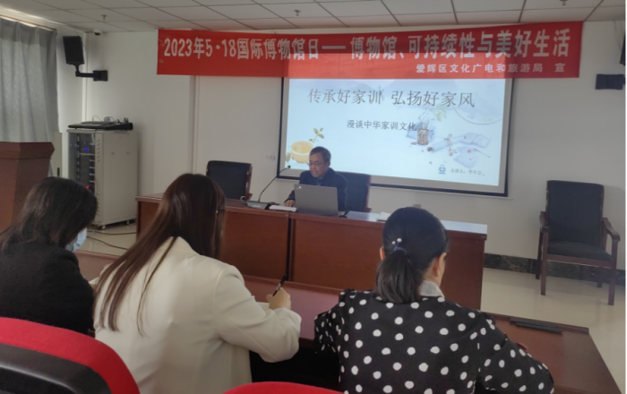习近平总书记在不同场合多次谈到要“注重家庭、注重家教、注重家风”,强调“家庭的前途命运同国家和民族的前途命运紧密相连”。为深入开展学习贯彻习近平新时代中国特色社会主义思想主题教育,5月17日,图书馆党总支在五楼微型报告厅举办了“传承好家训 弘扬好家风——漫谈中华家训文化”专题讲座主题党日活动,特邀原黑河市民进黑河市委副主任委员、爱辉记忆馆馆长李军会为本次宣讲嘉宾。图书馆全体馆员和北疆国文社团学生代表参加了本次活动。