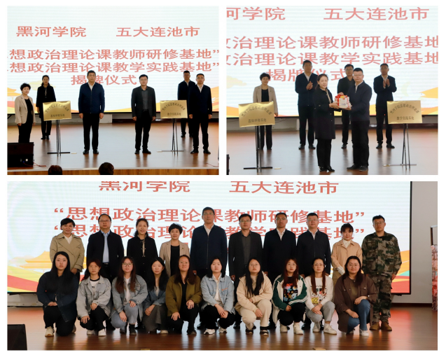 会上,张焕强、白淑艳为“思想政治理论课教师研修基地”揭牌,高孝成、姜辉为“思想政治理论课教学实践基地”揭牌;姜丽萍代表学校向五大连池市朝阳山东北抗联精神现场教学基地捐赠了图书。