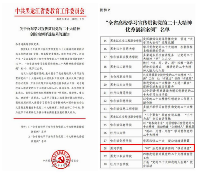 近日,省委教育工委下发了《关于公布学习宣传贯彻党的二十大精神创新案例评选结果的通知》(黑教工委函〔2023〕7号),评选产生“全省高校学习宣传贯彻党的二十大精神最佳创新案例”10个、“全省高校学习宣传贯彻党的二十大精神优秀创新案例”30个。我校人文传媒学院辅导员赵宇申报的《“00”后思政宣讲团的“移动课堂”》荣获“全省高校学习宣传贯彻党的二十大精神优秀创新案例”。